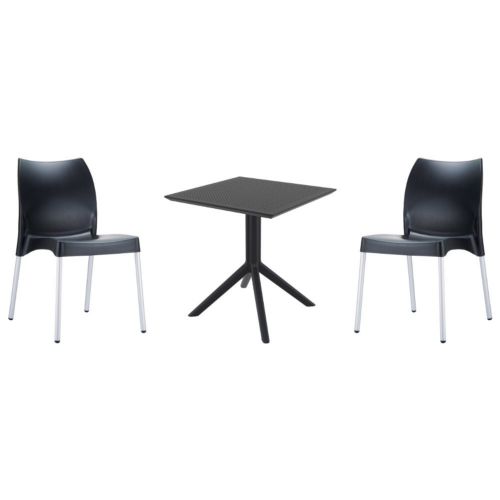 Introducing the Vita chairs and Sky 27" square table 3 piece dining set in Black - the perfect addition to any small outdoor living area! Crafted from high-quality polypropylene resin, this set is durable and weather-resistant, ensuring it will last you for years to come. Vita chairs feature a sleek and modern design, with a comfortable seat and backrest. Sky 27" square table providing ample space for two people to enjoy a meal or drink together.
