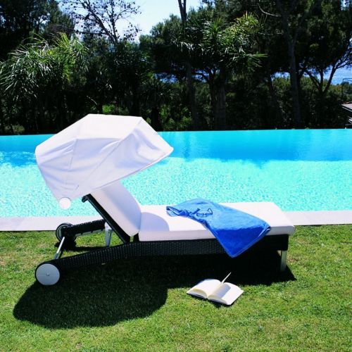 Biarritz outdoor chaise lounge from Triconfort. Contemporary and modern outdoor furniture design. Made from synthetic outdoor wicker over aluminum tubing. Maintenance free. Can be washed down with water. Totally outdoor resistant. Cushions are made from Sunbrella fabric and durable for outdoor use. Cushions included. Custom cushions are avilable in all Sunbrella colors. Dimensions: 80"L × 30"W × 14"H Wicker in Dark Chocolate Color. Optional canopy sold separately.