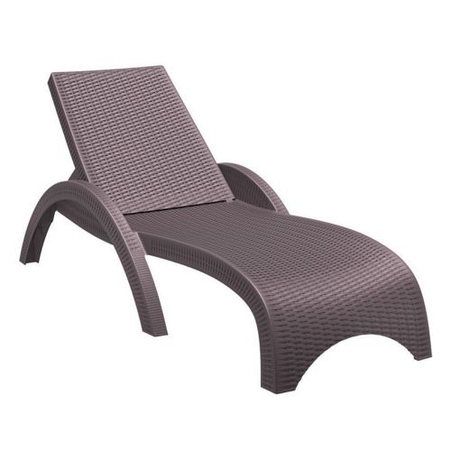 Wickerlook resin outdoor chaise lounge with arms in brown color. Beautiful woven-wicker-looking chaise lounger with 5 position adjustable back and recessed wheels. Wickerlook resin is a natural looking un-woven one piece furniture technology. Made with open weave design that resembles traditional woven wicker furniture. Unlike any other woven furniture in the market Wickerlook furniture will never unravel. Made for commercial durability. Chaises are stackable. Perfect for hotels, community pools and condos. UV treated. Hose down for cleaning. Withstands outdoor temperatures summer and winter. Certified for strict European standards by CATAS Italian research institute and test laboratory.