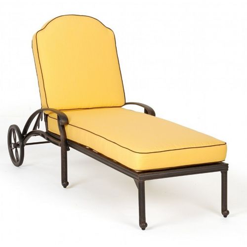 Florence cast aluminum outdoor chaise lounge with Sunbrella cushion. Traditional Mediterranean design. Strong cast aluminum structure with four inch Sunbrella cushions. Elegant, comfortable design with wheels for easy mobility. Outdoor chaise lounge is made of high quality cast aluminum and is triple polished with a powder coated paint and an antique finish. Cast aluminum won't chip, flake or scratch. Perfect for pool, beach, outdoors, garden and patio. Color: Desert Bronze. Cushions are made of Sunbrella fabric and available in multiple colors. Cushion included in price. Lays flat.
