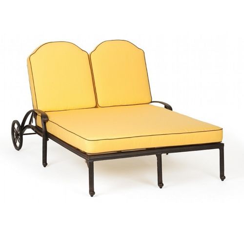 Florence cast aluminum outdoor double chaise lounge with Sunbrella cushion. Traditional Mediterranean design offering relaxed lounging for two persons. Chaise back is individually adjustable to 4 positions and lays flat.Strong cast aluminum structure with four inch Sunbrella cushions. Elegant, comfortable design with wheels for easy mobility. Double chaise lounge is made of high quality cast aluminum and is triple polished with a powder coated paint and an antique finish. Cast aluminum won't chip, flake or scratch. Perfect for pool, beach, outdoors, garden and patio. Color: Desert Bronze. Cushions are made of Sunbrella fabric and available in multiple colors. Cushion included in price.