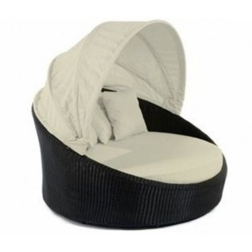 Hallo wicker outdoor day bed with canopy. Features sturdy aluminum frames covered with round all weather wicker. Great for large spaces. Very comfortable and spacious. Durable and comfortable outdoor cushions. Resistant to harsh outdoor conditions. Outdoor wicker is sleek and modern. Great choice for poolside, patio or deck. Wicker is available in Espresso. Cushions in natural color. Please call for extra color options. Daybed diameter 63 inches.