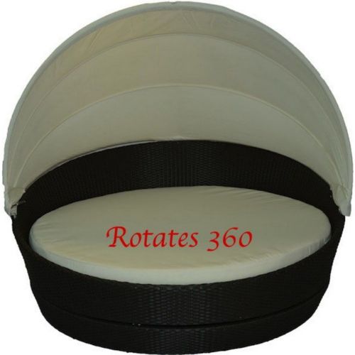 Round outdoor daybed with canopy is very comfortable and spacious, it features an aluminum frame covered with all weather dark brown wicker. Great for large spaces. Comfortable outdoor cushion and matching canopy. 360 rotation enables you to turn your daybed in any direction. Resistant to harsh outdoor conditions. Great choice for poolside, patio or deck. Daybed diameter is 63 inches. Accent pillows not included.