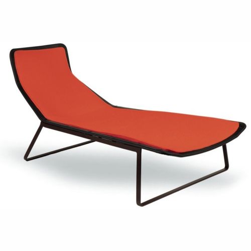 Maia outdoor chaise lounger with full cushion from Kettal. Contemporary designer outdoor collection. Maia outdoor chaise lounger is a full aluminum frame with wicker weave and porotex mesh cushions. Modern and sleek design. Available in chestnut frame. Cushions available in white, gray and orange. All cushions are made from padded mesh material. Cushion included.