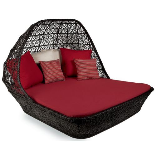 Maia outdoor double chaise with canopy from Ketal. Contemporary designer outdoor collection. Made out of full aluminum frame with wicker weave. Modern and sleek design. Available in chestnut and white frames. Cushions available in designer fabrics.