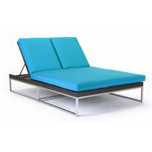 Mirabella modern wicker contemporary double chaise lounge. Stunning contemporary design with bold angles and sleek polished stainless steel frames. Double chaise is a luxurios addition to this collection. Resort style lounger with 4 inch cushions. Made from Viro outdoor wicker over strong stainless steel frame. Perfect for poolside or large patios. Can be washed down with water. Totally outdoor resistant. Cushions are made from Sunbrella fabric and durable for outdoor use. Cushions included. Wicker available in Dark Brown only.