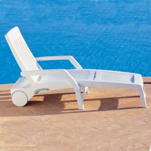 Nettuno white outdoor chaise lounge with arms. Resin chaise lounge is perfect for pool and beach areas. Raised arms provide comfort for reading. Wheels make it easy to move around. High quality marine grade resin plastic stays cool to the touch under hot sun. Extremely durable and comfortable. Commercial grade.