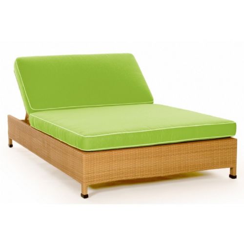 Point Dome outdoor wicker double chaise lounge daybed from Caluco. Resort style daybed lounger with 4 inch cushions. Contemporary and modern outdoor furniture design. Made from Viro outdoor wicker over strong extruded powder coated aluminum frame. Maintenance free. Perfect for poolside or large patios. Can be washed down with water. Totally outdoor resistant. Cushions are made from Sunbrella fabric and durable for outdoor use. Cushions included. Wicker available in Wheat only.