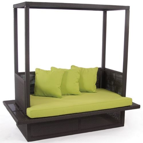 Rivera outdoor wicker modern day bed. Large daybed made with sturdy aluminum frames covered with all weather wicker. Durable outdoor cushions are thick and comfortable. Resistant to harsh outdoor conditions. Espresso wicker is sleek and modern. Great choice for large areas, poolside, patio or deck. Four inch thick cushion and pillows included. Cushions in natural color. Please call for more color options.