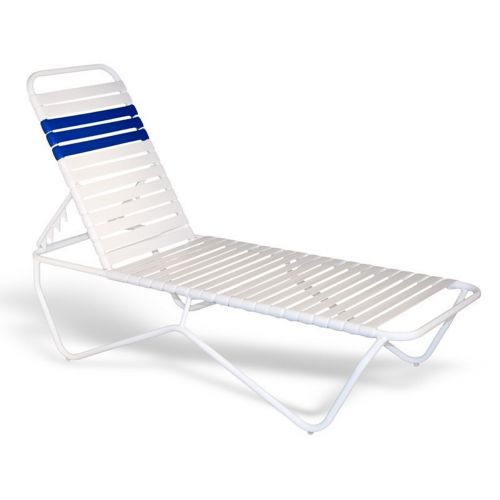 14 inch strap chaise lounge made for commercial use. Back adjustable to multiple positions and folds flat. Stackable. Aluminum white powder coated frames resistant to outdoor environments sun, rain and suntanning lotions. 2 inch thick PVC vinyl is made with 100% virgin vinyl against breakage. Double wrap strapping. Vinyl straps contain UV inhibitors for resistancy under sun. Dimensions: 80"L × 27"W × 14"H. White frames with white straps with 3 accent contrast colored straps. Choose from 6 accent colors.