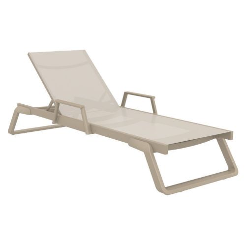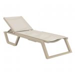 Tropic resort quality sling chaise lounge. Hybrid construction features aluminum and polypropylene frames. Simple sleek design with commercial strength. Sling is made with Serge Ferrari mesh fabric. Chaise is very comfortable and no need for cushions. Back adjustable to 5 positions and folds flat for more comfortable sun bathing. Recessed wheels for mobility. Stacks for easy storage. Large footstands for stability on any surface including beach and stone. Frame made of marine grade resin polypropylene. Extremely durable and comfortable. Commercial grade.