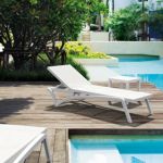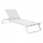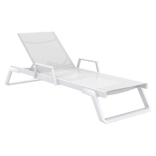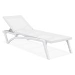 Tropic resort quality sling chaise lounge. Hybrid construction features aluminum and polypropylene frames. Simple sleek design with commercial strength. Sling is made with Serge Ferrari mesh fabric. Chaise is very comfortable and no need for cushions. Back adjustable to 5 positions and folds flat for more comfortable sun bathing. Recessed wheels for mobility. Stacks for easy storage. Large footstands for stability on any surface including beach and stone. Frame made of marine grade resin polypropylene. Extremely durable and comfortable. Commercial grade.