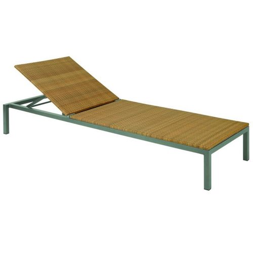 Kettal Via outdoor wicker chaise lounge with aluminum frames. Features aluminum tubing finished with polyester paint for extreme resistancy to outdoors. Seat and back in synthetic all weather, outdoor wicker. Back adjustable to multiple positions and folds flat. Chaise lounge has submerged wheels for mobility. Very elegant and aesthetic. High quality. Sleek and modern design. 100% outdoors resistant. Available in 2 color combinations. gray Frame - Natural Wicker and gray Frame - Etna Wicker. Via wicker chaise lounge is stackable. Dimensions: 28"W × 75"L × 13"H.