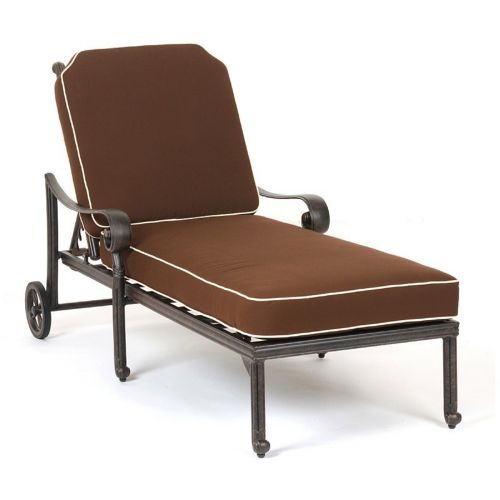 Victoria cast aluminum garden chaise lounge with cushion. Chaise back adjustable to multiple positions and has wheels for easy mobility. Traditional English garden design cast aluminum furniture. Collection items provide spacious proportions for relaxed deep seating. Strong cast and tubular frames come with four inch Sunbrella seat cushions. Aluminum is powder coated so it won't chip, fade, or scratch. Desert bronze color frames gives a traditional aged look. Perfect for outdoors. Cushions are made of Sunbrella fabric and available in multiple colors. Cushion covers can be machine washed. Cushion included in price. Frame color: Desert Bronze.