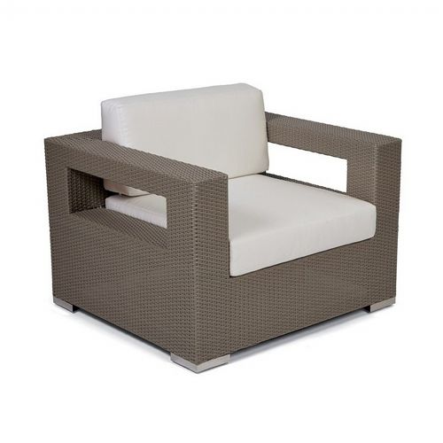 10Tierra wicker deep seating club chair. Contemporary patio furniture design. Made from all weather outdoor wicker over strong powder coated aluminum frame. Maintenance free. Can be washed down with water. Totally outdoor resistant. Cushions are made from 100% Sunbrella fabric and durable for outdoor use. Seat and back cushions included. Wicker available in Moccachino only. Cushions are 5 inch thick. Sunbrella fabric is available in multiple colors and patterns.