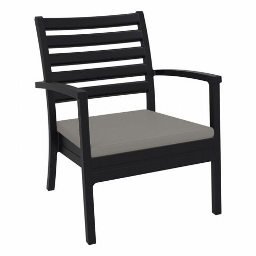Black Artemis resin outdoor club arm chair with taupe cushion. Contemporary design with super sturdy commercial strength. Made from commercial grade resin with gas injection molded legs. Stacking club chairs are perfect for heavy use areas. Casual and modern design make it suitable for indoors and outdoors. Polypropylene frame resists sun, oils, chlorine and all outdoor conditions. Certified for strict European standards by CATAS Italian research institute and test laboratory.