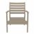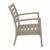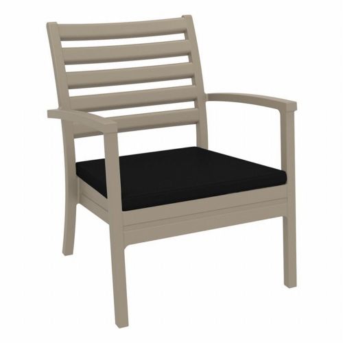 Taupe Artemis resin outdoor club arm chair with black cushions. Contemporary design with super sturdy commercial strength. Made from commercial grade resin with gas injection molded legs. Stacking club chairs are perfect for heavy use areas. Casual and modern design make it suitable for indoors and outdoors. Polypropylene frame resists sun, oils, chlorine and all outdoor conditions. No metal parts that can rust. Certified for strict European standards by CATAS Italian research institute and test laboratory.