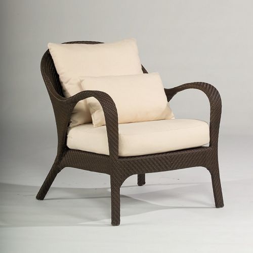 Bali all-weather wicker club chair from Whitecraft. Traditional yet modern looks. Powdercoated non corrosive aluminum frames woven with all-weather wicker. High density polyethylene wicker mimics natural beauty and character of wicker and provide maintenance free comfort. Collection items can be left outdoors year round. Wicker will not rot, peel or fade. Cushions are made with high quality outdoor fabrics. Wicker offered in Coffee Brown. Cushions are available in multiple colors. Seat and back cushions are included in price.