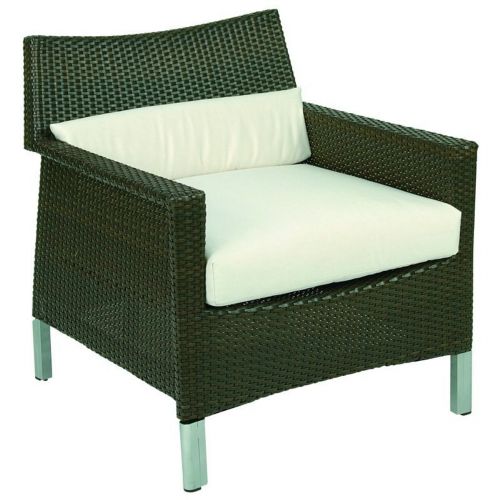 Biarritz outdoor club arm chair from Triconfort. Contemporary and modern outdoor furniture design. Made from synthetic outdoor wicker over aluminum tubing. Maintenance free. Can be washed down with water. Totally outdoor resistant. Cushions are made from Sunbrella fabric and durable for outdoor use. Cushions included.