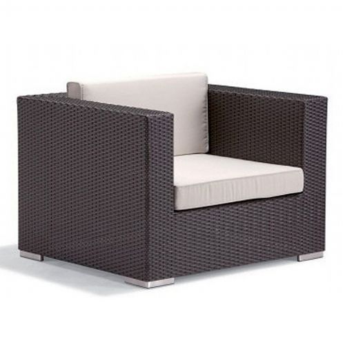 Dijon outdoor wicker deep seating club chair. Contemporary and modern patio furniture design. Made from all weather outdoor wicker over strong extruded powder coated aluminum frame. Maintenance free. Can be washed down with water. Totally outdoor resistant. Cushions are made from 100% acrylic fabric and durable for outdoor use. Seat and back cushions included. Wicker available in Espresso only. Cushions are 4 inch thick.