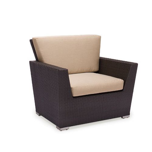 Maxime outdoor wicker deep club arm chair from Caluco. Bold geometric design. Plush and thick Sunbrella cushions. Made from Viro outdoor wicker over strong aluminum frames. Maintenance free. Can be washed down with water. Totally outdoor resistant. Viro outdoor wicker is handbraided and highly resistant to fading, cracking or mildew. Cushions are made from Sunbrella fabric and durable for outdoor use. Seat and back cushions included. Wicker available in Espresso only. Cushions are 4 inch thick.