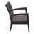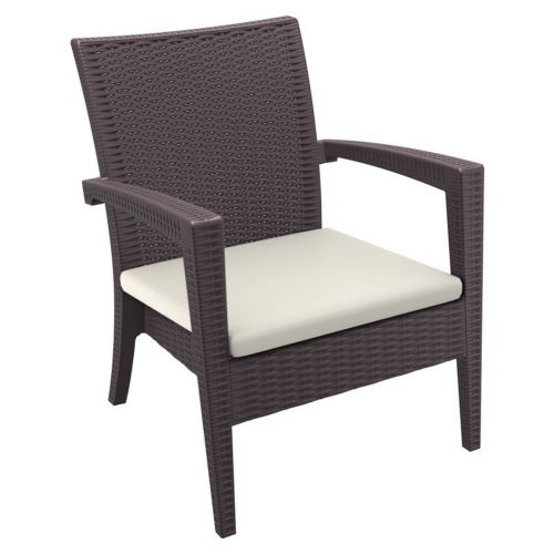 Miami brown Wickerlook resin patio club chair with cushion. Wickerlook resin is a natural looking un-woven one piece outdoor furniture technology. Wickerlook patio furniture is made with open weave design that resembles traditional woven wicker furniture. Unlike any other woven furniture in the market Wickerlook furniture will never unravel. Made for commercial durability. Stackable. Perfect for hotels and restaurants. UV treated. Hose down for cleaning. Made for outdoors. Withstands outdoor temperatures summer and winter. Certified for strict European standards by CATAS Italian research institute and test laboratory. Includes