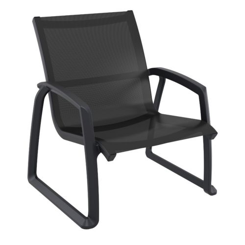 Black Pacific resort quality club lounge arm chair. Simple sleek design with commercial strength. Sling is made with Serge Ferrari mesh fabric. Club chair is very comfortable and no need for cushions. Stacks for easy storage. Frame made of marine grade resin polypropylene. Extremely durable and comfortable. Commercial grade.