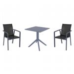 Dark gray frame with Black Sling Pacific resort quality club lounge arm chair. Simple sleek design with commercial strength. Sling is made with Serge Ferrari mesh fabric. Club chair is very comfortable and no need for cushions. Stacks for easy storage. Frame made of marine grade resin polypropylene. Extremely durable and comfortable. Commercial grade.
