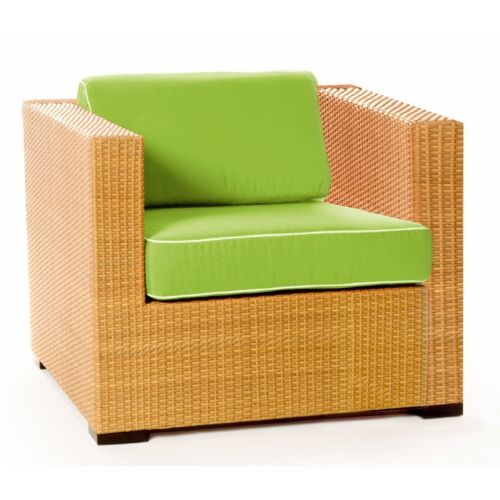 Point Dome outdoor wicker club arm chair from Caluco. Contemporary and modern outdoor furniture design. Made from Viro outdoor wicker over strong extruded powder coated aluminum frame. Maintenance free. Can be washed down with water. Totally outdoor resistant. Cushions are made from Sunbrella fabric and durable for outdoor use. Seat and back cushions included. Wicker available in Wheat only. Cushions are 4 inch thick.