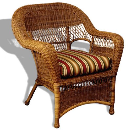Sanibel collection traditional outdoor club chair from Tortuga Outdoor. The decorative detailed wicker, combined with the thick comfy cushions make the Sanibel collection a must have for your outdoor living space. Collection items feature aluminum frames, UV stabilized round all weather wicker, and 100% spun polyester, mildew and fade resistant outdoor cushions. Hand braided round wicker is detailed and elegant. Thick cushions offer comfortable seating. Traditional looks for classic comfort. Wicker offered in mocha. Cushions in Weston Ginger fabric.