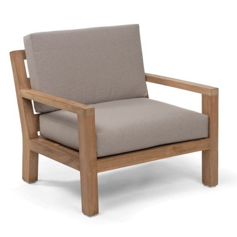 Modern teak patio club chair with cushion. Made with kiln-dried, grade a teak wood. Modern and simple design. Teak wood is natural and suitable for outdoors. Requires regular teak wood maintenance. Cushions are made of Sunbrella fabric and available in multiple colors. Seat cushions are 5 inch thick. Price includes seat cushion.