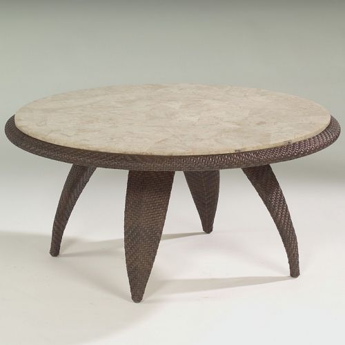 Cocktail Table with Stone Top from Whitecraft. Made with aluminum frames woven with synthetic outdoor wicker. Specifically made for outdoors. All weather wicker is resistant to sun, water, rain and snow. Strong aluminum frames. Available in Coffee weave.
