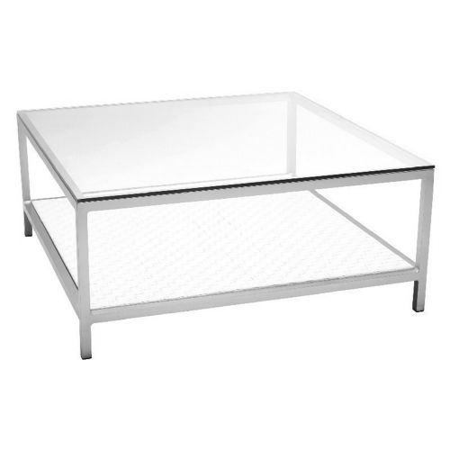 Tidelli Cube square center table with shelf. Hand finished aluminum tubing with synthetic Ti-Flex wicker. Resistant to outdoors. Includes clear glass table top with a bottom shelf. Wicker available in 6 high gloss colors. Frame in silver color. Dimensions: 40" × 40"W × 16"H