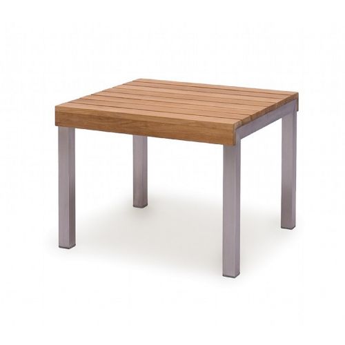 Grace sqaure outdoor end table. Clean, modern and bold design. Strong stainless steel and grade A teak structure. Table is made of high quality natural teak over stainless steel frames. Stainless steel won't chip, flake or scratch. Perfect for outdoors and patio. Teak is natural and requires oiling periodically.