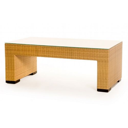 Mayan outdoor wicker rectangular coffee table with glass top from Caluco. Measures 60 inches long and 30 inches wide. Contemporary and modern outdoor furniture design. Great as center table for deep seating groups. Made from Viro outdoor wicker over strong extruded powder coated aluminum frame. Stainless steel hardware. Maintenance free. Can be washed down with water. Totally outdoor resistant. Wicker available in Wheat only.