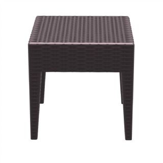 Miami woven-wicker-looking brown square side table. Wickerlook resin is a natural looking un-woven one piece furniture technology. Wickerlook patio furniture is made with open weave design that resembles traditional woven wicker furniture. Unlike any other woven furniture in the market Wickerlook furniture will never unravel. No metal parts to rust, no moving parts that can break. Made for commercial durability. Perfect for hotels and restaurants. UV treated. Hose down for cleaning. Withstands summer and winter outdoor temperatures. Made for outdoors.
