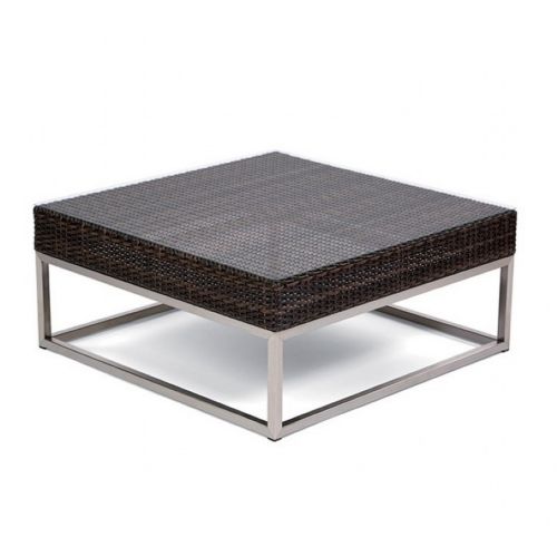 Mirabella modern wicker contemporary end table with 35 inches square top. Stunning contemporary design with bold angles and sleek polished stainless steel frames. Made from Viro outdoor wicker over strong stainless steel frame. Perfect for poolside or large patios. Can be washed down with water. Totally outdoor resistant. Wicker available in Dark Brown only. Glass top included.