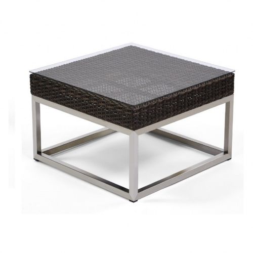 Mirabella modern wicker contemporary end table with 24 inches square top. Stunning contemporary design with bold angles and sleek polished stainless steel frames. Made from Viro outdoor wicker over strong stainless steel frame. Perfect for poolside or large patios. Can be washed down with water. Totally outdoor resistant. Wicker available in Dark Brown only. Glass top included.