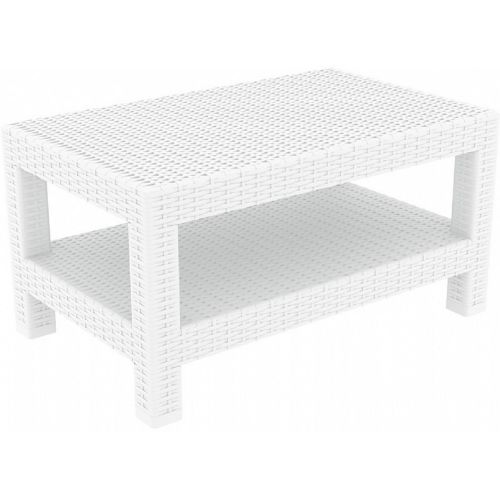 Monaco woven-wicker-looking coffee table with a magazine rack. Wickerlook outdoor furniture is made with open weave design that resembles traditional woven wicker furniture. No metal parts to rust, no moving parts that can break. Made for commercial durability. Perfect for hotels and restaurants. UV treated. Hose down for cleaning. Withstands summer and winter outdoor temperatures. Made for outdoors.