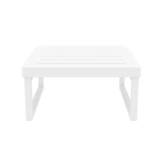 Mykonos white resin square coffee table. Modular contemporary design with commercial strength. Made from commercial grade polypropylene resin. Perfect for heavy use areas. Casual and modern design makes it suitable for indoors and outdoors. Polypropylene frame resists sun, oils, chlorine and all outdoor conditions.
