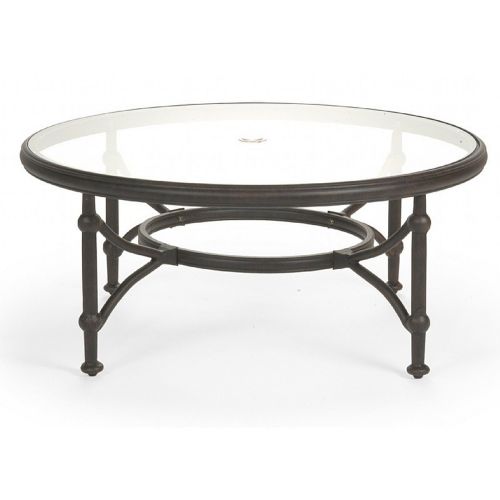 Origin cast and tubular aluminum coffee table with 42 inch diameter with glass top. Classic Mediterranean design cast aluminum furniture collection. Great for deep seating arrangements. The top is made out of 5mm thick tempered glass. Strong cast and tubular frames. All corners are welded 360° for maximum strength and powder coated so it won't chip, fade, or scratch. Perfect for outdoor dining. Plastic foot levelers included.