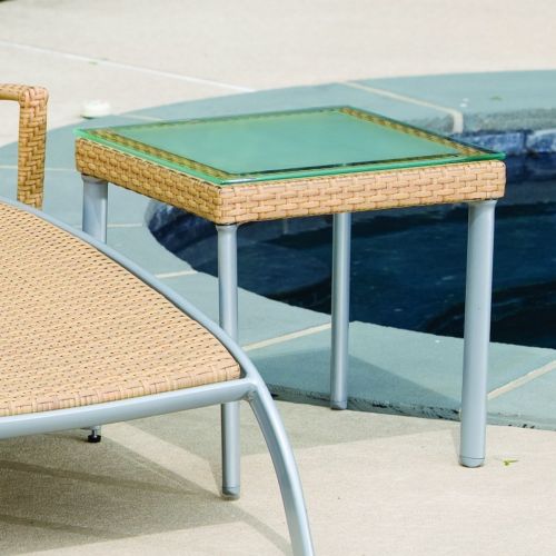 Sabbia outdoor wicker side table with glass top. Features sturdy aluminum frames wrapped with all weather wicker. Resistant to harsh outdoor conditions. Vento side table dimensions: 18 inches wide × 18 inches long × 18 inches high. Great choice for poolside, patio or deck. Includes smoked galss top. Color: Natural.