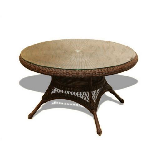 Sea Pines collection 42 inch round outdoor conversation table from Tortuga Outdoor. This is a 25 inch high table to be used with club chairs. Collection items feature powder coated aluminum frames, UV stabilized all weather wicker. Traditional looks for a classic comfort. Wicker offered in coffee brown. Glass table top with umbrella hole.