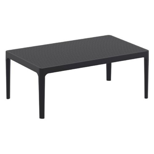 Sky rectangle resin outdoor coffee table. Commercial grade polypropylene construction with a concealed metallic frame makes this table strong and durable. Perfect for heavy use areas, patios, balconies, poolsides. Table top has pinholes that helps with rain water drainage and creates a modern look. Resin table is resistant to UV, suntan oils, saltwater and chlorine. Easy assembly required.
