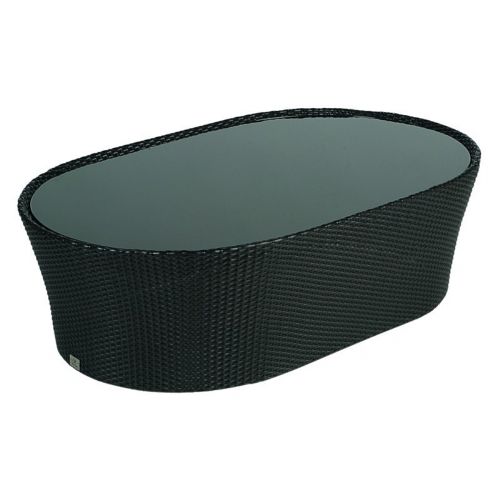 Venezia oval outdoor coffee table from Kettal. New for 2008. Venezia collection features modern european design. Outdoor coffee table is made with aluminum framing and all weather wicker. Glass table top protects surface. Unsurpassed craftsmanship and ultimate luxury. Dimensions: 28 inches wide, 44 inches long, 14 inches high. Wicker available in chestnut. Clear glass top included.