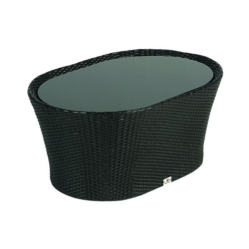 Venezia oval outdoor side table from Kettal. New for 2008. Venezia collection features modern european design. Outdoor side table is made with aluminum framing and all weather wicker. Glass table top protects surface. Unsurpassed craftsmanship and ultimate luxury. Dimensions: 20 inches wide, 28 inches long, 14 inches high. Wicker available in chestnut. Clear glass top included.