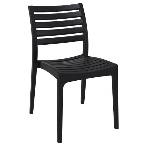 Ares black outdoor dining chair. Comfortable seat and back. Super sturdy commercial strength. Made from commercial grade resin with gas injection molded legs. 100% polypropylene construction. No metal parts. Heavier than most resin chairs of its type. Stacking chairs are perfect for heavy use areas. Preferred by restaurants, cafes and hotels. Certified for strict European standards by CATAS Italian research institute and test laboratory.