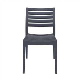 Ares outdoor dining chair. Comfortable seat and back. Super sturdy commercial strength. Made from commercial grade resin with gas injection molded legs. 100% polypropylene construction. No metal parts. Heavier than most resin chairs of its type. Stacking chairs are perfect for heavy use areas. Preferred by restaurants, cafes and hotels. Certified for strict European standards by CATAS Italian research institute and test laboratory.