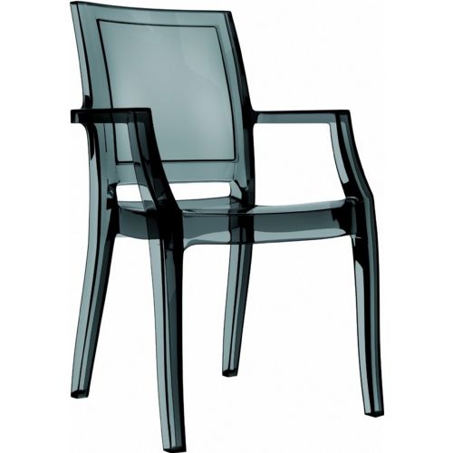 Arthur transparent black indoor outdoor arm chair. Made with unbreakable polycarbonate. Modern contemporary design. Can be used both indoors and outdoors. Scratch resistant. Commercial grade polycarbonate. Fire rating as self-extinguish classification V2. Strong legs and structure. Stackable. Very elegant. UV resistant. Certified for strict European standards by CATAS Italian research institute and test laboratory.