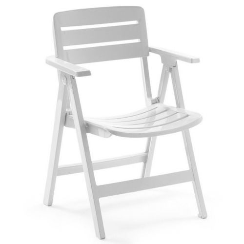 Evolutif Ascot lacquered resin folding armchair. High gloss lacquer coated resin gives an elegant look for any pool and patio area. White lacquered resin. Resistant to chlorine and suntan oils. Resin patio furniture stays cool to the touch under hot sun. Dimensions: 23"W × 25"D × 33"H Weight: 14.7 lbs.